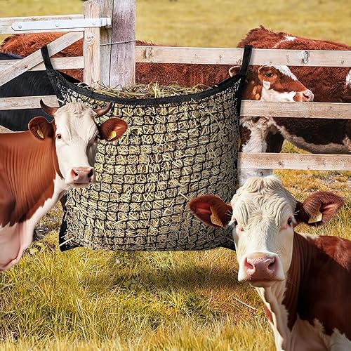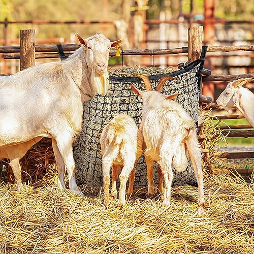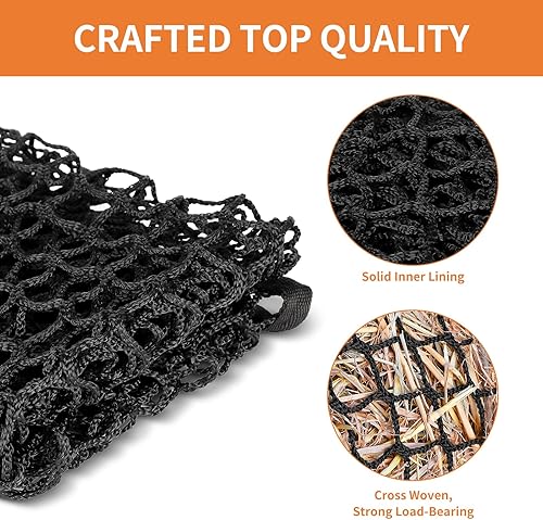 【Easy To Fill And Hang】 The hay feeder features a large opening, making it easy to fill and thereby saving you time. The hay net is equipped with two handle rings at each end and two support ties in the middle, allowing for easy attachment to stalls, trailers, walls, fences, and more.