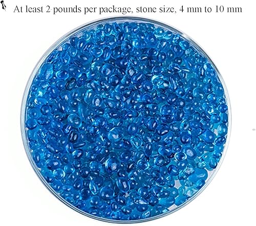 At least 2 pounds per package, glass pebble size, 4 mm to 10 mm. 100% Glass material.