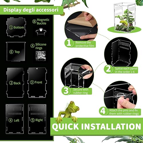 【Easy to Assemble】First tear off the protective paper of the praying mantis habitat, the reptile cages only take a few minutes to install, and the silicone ring is fixed after each step, which makes it even stronger. Remove when not in use to save storage space.