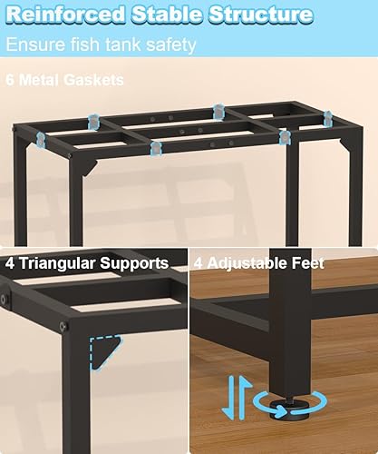 Sturdy And Stable: The top stand features a cross-shaped frame, offering enhanced stability and greater load bearing capacity. The 4 corners of the top are reinforced with triangular supports, further strengthening the overall stability. Additionally, the base is equipped with 4 height adjustable feet to ensure the floor from scratches. On each side of the top, there are 6 removable metal gaskets to avoid accidental wobbling or sliding of the aquarium, ensuring safe and secure fish viewing
