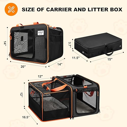 【Expand to provide more space in car travel】 Size of carrier is 20(L) x 14(W) x 14(H) inches, size of expandable part is 16.5 x 12 x 12 inches ),the expandable part can provide a extra space as an activity/play zone for pet,you can put a small portable cat litter box in expandable part and let pet stay in body of carrier.