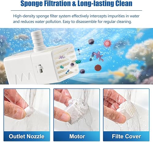 【Sponge Filtration & Long-lasting Clean】: Built-in high-density sponge filtration system, effectively intercepting impurities in the water, reducing water pollution and protecting the core components of the pump. Simple disassembly of the filtration components and housing, convenient for regular flushing and cleaning, to keep the pump running efficiently. Create a healthy living environment for aquatic organisms and also make your water feature installation always clear and beautiful.