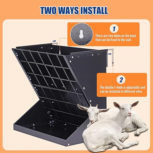 Two Ways To Use: The livestock hay feeder can hang on the fence by the double adjustable L-shaped hook, you can adjust the length freely, or wall mount on the wall through the two pre-drilled holes on the back panel of the hay feeder