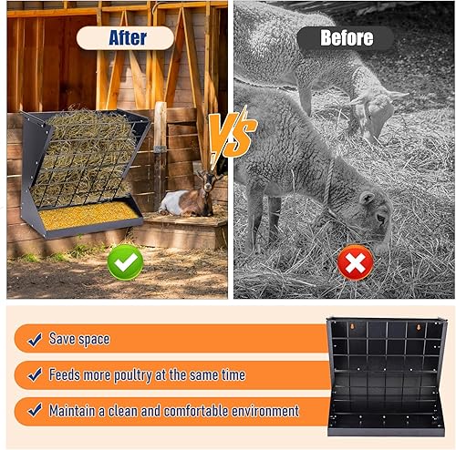 2 IN 1 Upgrade Design: Our 2-in-1 goat hay feeder has a deeper removable tray, the goat hay rack not only can hold more grain, but also can collect fallen hay, less waste
