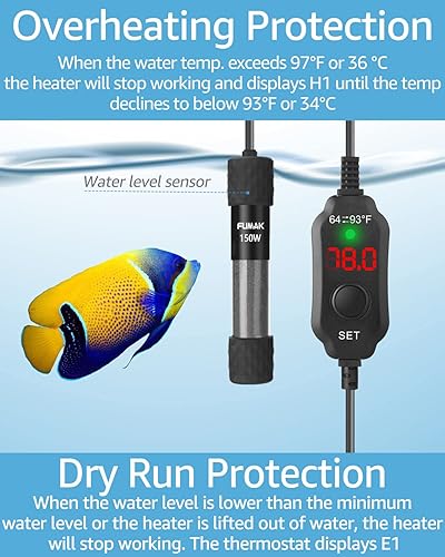 DRY RUN / OVERHEATING PROTECTION – Full consideration of safety. With the multiple protections this fish tank heater will stop working when the water level is lower than the minimum water level (DRY RUN PROTECTION) or when the water temperature exceeds 97F (OVERHEATING PROTECTION). You are free from “cooking fish”!