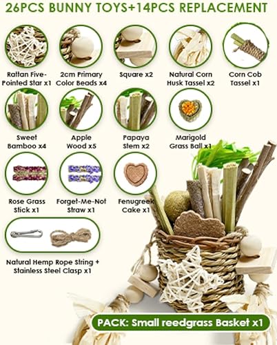 ✅26PCS RABBIT CHEW TOYS FOR TEETH+14PCS REPLACEMENT PACK: Small reedgrass Basket x1, Rattan Five-Pointed Star x1, 2cm Primary Color Beads x4, Square x2, Natural Corn Husk Tassel x2, Corn Cob Tassel x1, Sweet Bamboo x4, Apple Wood x5, Papaya Stem x2, Rose Grass Stick x1, Forget-Me-Not Straw x1, Fenugreek Cake x1, Marigold Grass Ball x1, Natural Hemp Rope String + Stainless Steel Clasp x1. Replacement Pack: Papaya Stems x5, Apple Wood Stems x5, Grass Cake x1, Rose Flower Ball x1, Marigold Stick x1. More variety and quantity than anyone else's, with complimentary replacements to recycle without waste