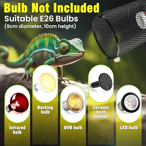 【Suitable for All E26 Heat Bulbs】The size of reptile heater cover is about 7.9 inch/ 20 cm in height, 4.1 inch/ 10.5 cm in bottom diameter, suitable for various kinds of bulbs, like heat bulb, ceramic emitter, fluorescent lamp, basking bulb, night light bulb, UVA/ UVB bulb, spotlight, and more; Please confirm the bulb's size before purchase.