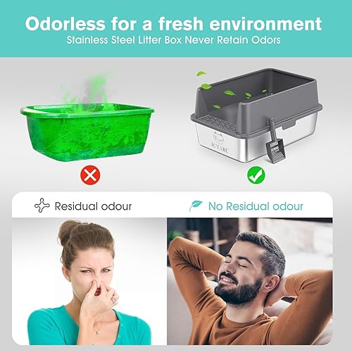 【Durability means saving money and effort】:ICYAIR cat litter box is made of high quality stainless steel. It is rust free and sturdy. It is not only stands up to the wear and tear of daily use but also prevents scratches from cat claws. All of these features are contributing to an extended service life at least 3-5 years. Investing in this stainless steel litter box is akin to saying farewell to the hassle of replacing plastic alternatives.