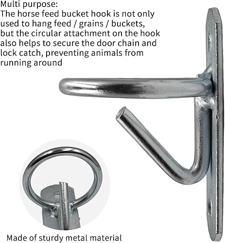 Multi purpose: The horse feed bucket hook is not only used to hang feed/grains/buckets, but the circular attachment on the hook also helps to secure the door chain and lock catch, preventing animals from running around.