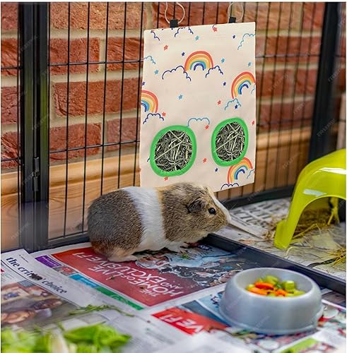 CUTE DESIGN: Patterned with cute and colorful rainbow, adorable printings add a touch of cuteness and bright colors to your pet’s living space. This hay bag will enhance the aesthetic appeal of pet living environment.