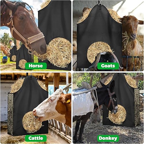 【Moderate Capacity】The hay feeder measures 19x27x6 inches (50x69x15cm), which is not too bulky and can hold enough hay. It also comes with a sturdy and adjustable webbing for quick removal and easy hanging. The length of the webbing can be adjusted to suit different horses and goats, making it convenient to adjust the height of the bag according to their needs.