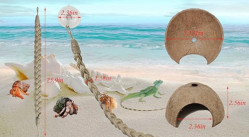 Excellent size: The size of the natural coconut shell is 5.12inx2.56in. The natural coconut shell provides hermit crabs with plenty of space to play and move around, the climbing rope is 25.9inx1.58in, made of resistant hemp rope, corrosion resistant and not easy to break, the rope is widened and designed to be used by large lizards and hermit crabs without any pressure.
