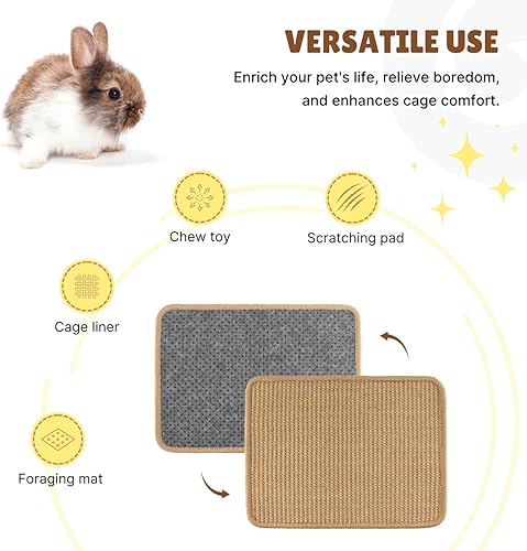 Versatile Use: It can serve as a scratching pad, chew toy, play mat, or cozy cage liner for rabbits, enriching their lives, relieving boredom, and enhancing cage comfort.
