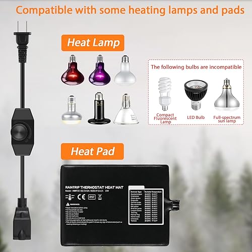 Multiple uses: The reptile thermostat can be connected to heating lamps, heating pads and other equipment, and can be used for reptiles, amphibians, egg hatching, plant seedlings and other equipment that need to control temperature