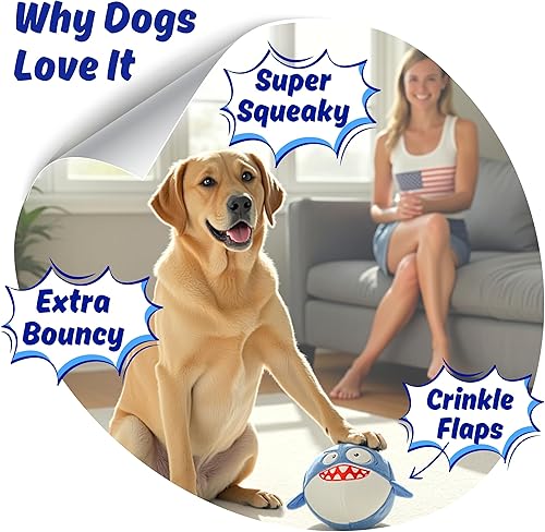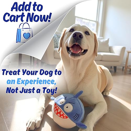 SQUEAKY & CRINKLY: Featuring a built-in super squeaker, crinkle flaps, premium plush fabric, and a hidden bouncing ball, Sharky keeps heavy chewers, puppies, small, medium, and large breeds entertained. This interactive toy delivers endless stimulation, fetch fun and puzzle like play.