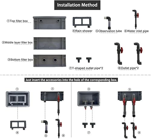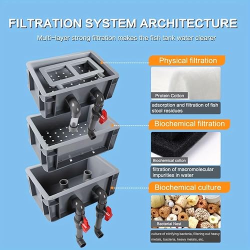 [Note] The aquarium filter box only has boxes, excluding power systems such as pumps. [Product Features] The fish tank filter box adopts a three-layer filtration system, which can place filter cotton, filter material, and nitrifying bacteria nest. They can carry out physical filtration, biochemical filtration, and microbial culture respectively. So as to efficiently purify water and ensure that your fish live in clear and simple water