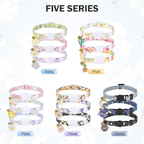 - 3 PACK: This cat collar contains three different colored cat collars and are available in a variety of styles- such as 3pcs cute animal pattern cat collars, 3pcs fruit kitty collars, 3pcs litter flower kitten collars, 3pcs daisy charms cat collars, 3pcs denim moon and star cat collars, and so on! Suitable for every season, especially spring and summer, ideal for your pets to wear on most occasions, such as daily walking, traveling, accessorie for your cutest furry friend or family with 2 cats.