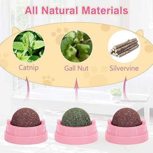 【Unique Design of Catnip Toy】The cat toy can easily stick to the wall or other surfaces with strong viscous force, no falling off when your kitten licks and plays. You can give him cat stuff and let him choose his favorite flavor.The catnip treat balls can be rotated 360 degree when licking.