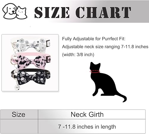 3 Pack Halloween-themed Design: Includes three adorable Halloween cat collars featuring classic skull bat and spider wed patterns in white, pink, and black. Each collar comes with a detachable bow tie and a removable bell, allowing customizable festive styling for your cat.