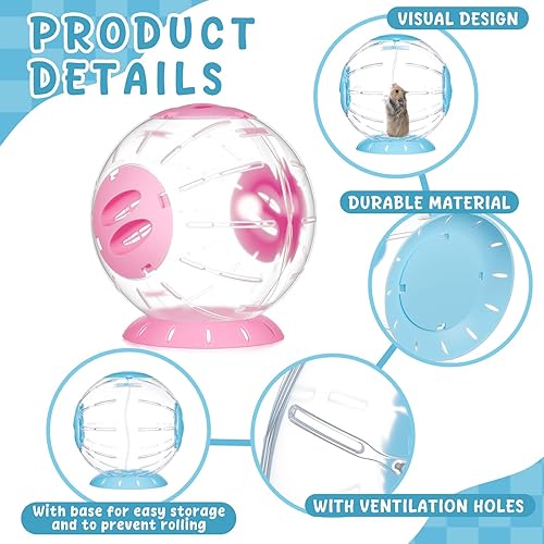 Vibrant Variety Set: the hamster ball set offers a diverse selection, featuring three colorful toy running balls; This set includes two blue and one pink ball, catering to families with multiple pets; The variety in color and size not only suits different hamsters but also makes for an appealing gift option for pet-loving friends and family:When the ball is not in use, it can be placed on the base to prevent it from rolling and facilitate storage