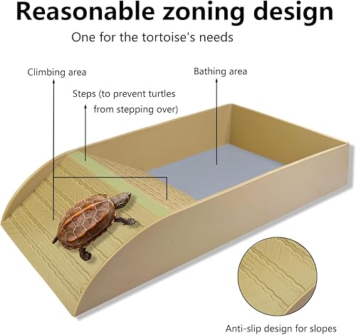【Ramp Anti-skid Design】: Tortoise water dish with a ramp anti-skid design, in the two low-angle ramp surface, with a wave groove texture, to play the role of anti-skid, effectively help the turtle up and down the slope and prevent the fall.