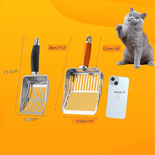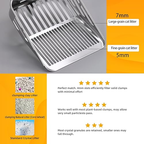 [Durable 304 Stainless Steel Litter Scoop] Made with 0.7mm thick 304 stainless steel, this cat litter scoop is rust-resistant, sturdy, and long-lasting. The one-piece stamped metal litter scoop design has no weld spots, making it stronger and more reliable than plastic or welded scoops.