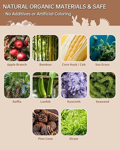 31 Pcs Various Chew Toys: The set includes 2 Seagrass-Wrapped Sweet Bamboo Sticks, 2 Seagrass-Wrapped Apple Sticks, 1 Paper Raffia, 2 Apple Wood Blocks, 2 Sweet Bamboo Sticks, 2 Apple Sticks, 4 Corn Husks, 2 Loofah Slices, 2 Papaya Wood Sticks, 2 Seagrass Twists, 1 Woven Seagrass Carrot, 1 Corn Cob, 1 Hyacinth Ball, 1 Seaweed Ball, 1 Pine Cone, and 1 Grass Bed.