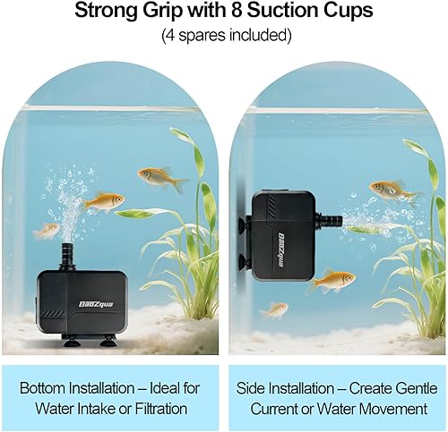 Wide Application Use: Perfect for aquariums, garden fountains, waterfalls, hydroponics and small pond pumps; includes 8 suction cups (4 backups) for flexible placement in aquariums or submersible outdoor fountain setups.
