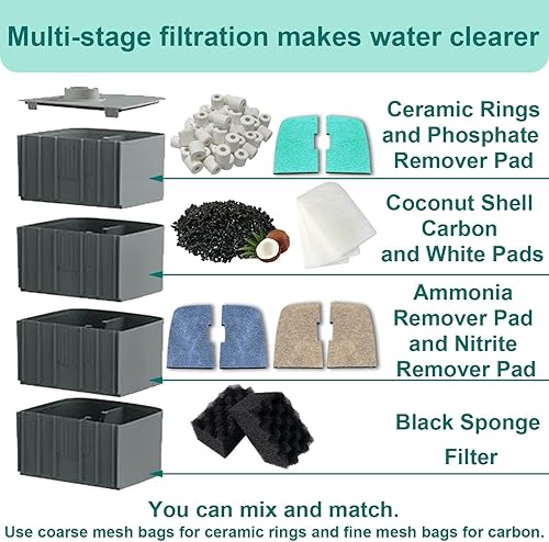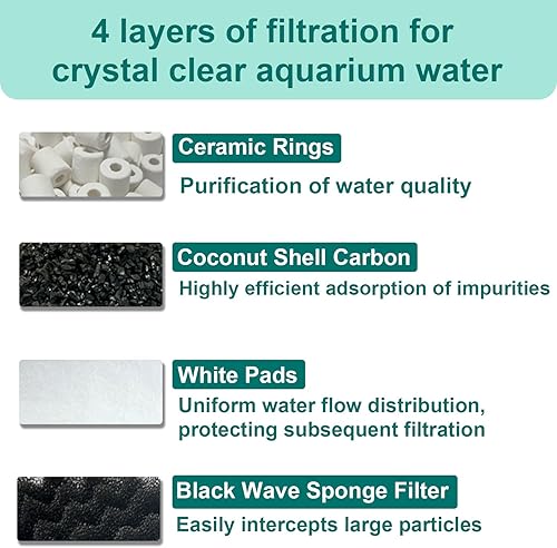 Multiple Filtration: Activated carbon purifies water by removing odors. Ceramic rings aid filtration. Filter pads collect particles effectively. Bio sponge removes ammonia and nitrite, keeping aquariums clean, healthy and odor-free