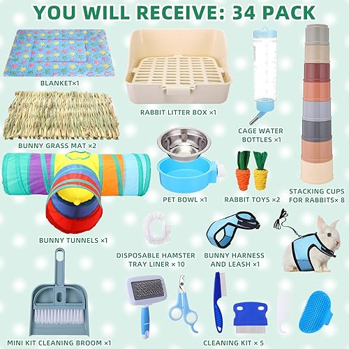 Comprehensive Package: with 34 items including a rabbit litter box, a pet blanket, a small pet nail scissors, two straw mats, a mini dustpan and brush set, thin rabbit cage liners, a small pet bowl, a hanging automatic food and water dispenser, rabbit toys, a rabbit leash set, a rabbit tunnel, a set of rabbit stacking cups in 8 different colors and a grooming kit