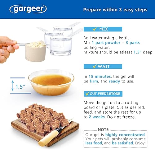 YOU GET MORE. Gargeer gels are complex nutritional formula that come as a concentrated powder, and gel when you add boiling water. You can now prepare a moist food for your animal that is superior to any dehydrated flakes or pellets. 3 oz of powder makes roughly 1 pound of ready to use product.