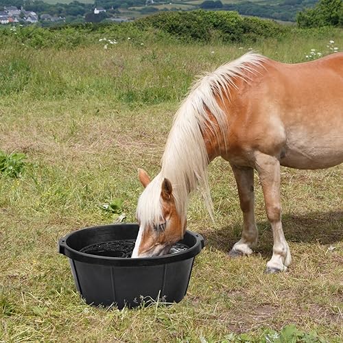 Perfect size:Each rubber bucket measures roughly 18.11 inches in diameter and 10.63 inches tall giving plenty of room to hold a large amount of feed without spills; The thick rubber pan design keeps the tray steady, so it won’t tip over or get kicked around easily