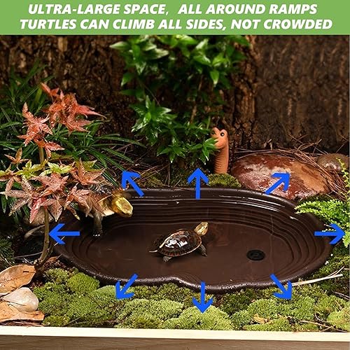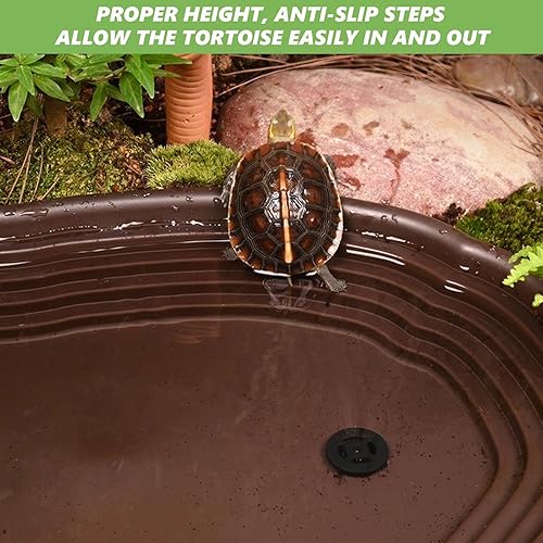 ANTI-SLIP & LOW-ENTRY RAMP: The oval tortoise water dish is inspired by terraces with non-slip steps all around, makes it easier for reptiles to climb in and out without restriction or crowding. Smooth surface, not damage turtle, also easy to clean
