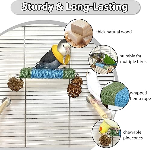 3pcs Bird Perch: This bird platform perch set includes a hemp rope-wrapped wooden platform (sized 6.0''x3.5'') adorned with pinecones and 2pcs 6'' wooden perch sticks. Good for multiple birds to rest and play, offering a spacious activity area for parrot