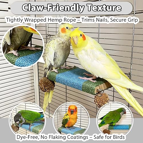 Claw-Friendly Texture: Our bird flat perch feature tightly wrapped hemp rope with textured surfaces, naturally trimming birds' nails while providing a secure gripping surface. Free of dyes or flaking coatings, ensuring a safe experience for birds