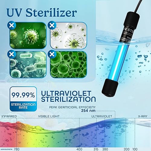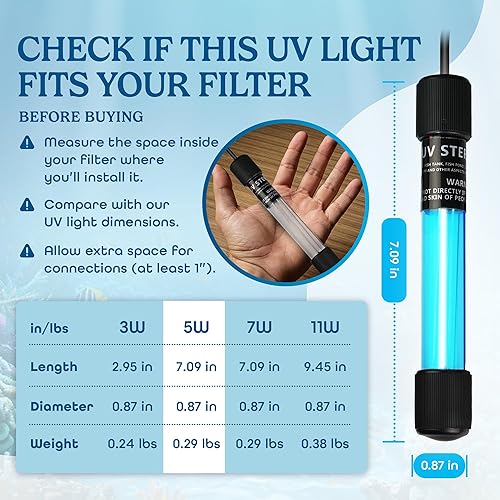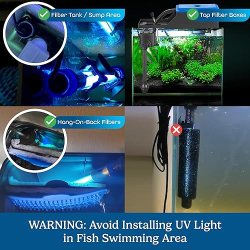SAFE AND VERSATILE PLACEMENT: Install the UV light in sump filters, top filter boxes, bottom filter tanks, or external filter chambers for optimal results. If used directly in the tank (not recommended), the included pre-filter sponge helps protect fish from direct exposure.