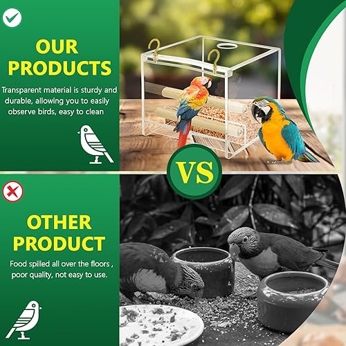 Wooden Stand Stick: Birds flying into bird cage feeder can stand directly on stand, and non-slip wood stand is designed to fit bird's feet, making bird very comfortable and free in cage. On one side is a place to put food, and on other side is a shelf for birds to stand and eat. Clear bird feeder reduces waste and keeps bird cages and floors clean.