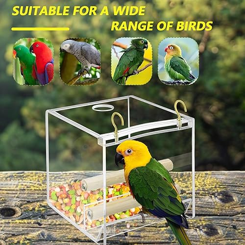 Easy to Assemble: This bird feeder for cage comes with 2 wooden poles, 2 screws and 2 hooks for easy installation. Just hand screw rod and hook to complete installation, no tools required. Acrylic bird feeder can be hung in a round or square cage.