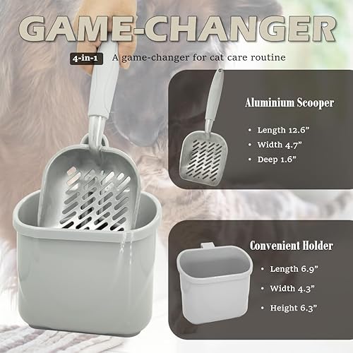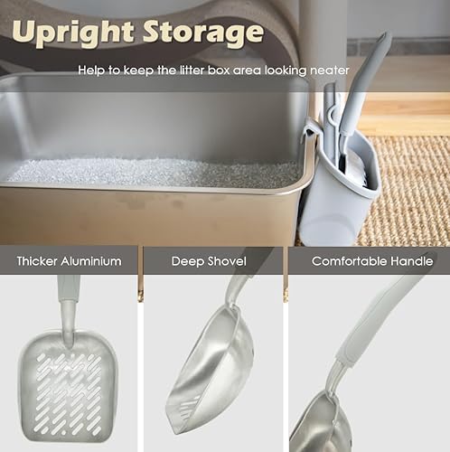 Space Saving - The scoop set may conveniently hang from the back of any Kitty Litter Box and neatly stows all essential cat box cleaning tools. It has its own stand so you have an actual place to put the scoop