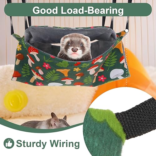 Complete 4-Piece Set: This versatile ferret hammock for cage includes four different style hammocks in adorable mushroom patterns - a square nest, hanging bed, tunnel hideout, and flat blanket. Perfect ferret hammocks set provides multiple resting and playing options for your small pets, keeping them entertained and comfortable throughout the day.