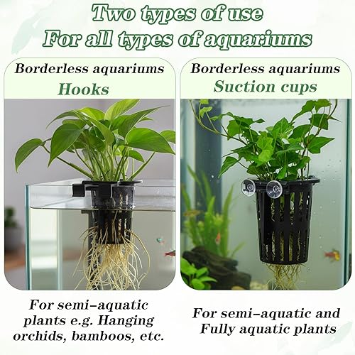 Versatile Installation Options: The aquarium plant holders offer two installation methods. They can hang on aquarium edges (thickness <0.87”) via hooks or attach to glass with suction cups. Suitable for rimmed and rimless tanks, they stably support plants like pothos and bamboo, adapting to various aquarium types