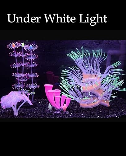 PACKAGE CONTENTS : You will get 4 pieces glowing aquarium fish tank decorations, including 1 piece glowing feather coral,1 piece pink glowing sucker coral ,1 piece green glowing anemone and 1 pieces of artificial Glowing Horn Coral