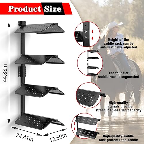 Adjustable height: The four-tier saddle rack has multiple adjustable settings to alter the height between each saddle, accommodating different saddle sizes
