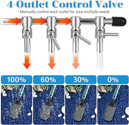 【Precision Air Flow Control】Features 4 individual lever valves that allow manual adjustment of each outlet's airflow, perfect for simultaneously running multiple air stones, filters, or decorations in your aquarium setup