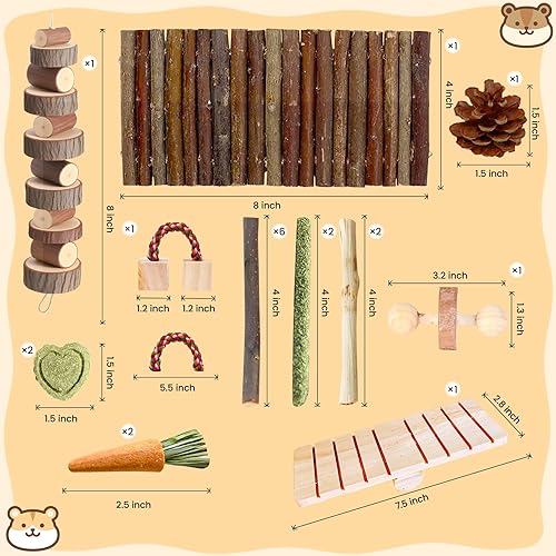 【Dental Health Protection】Hamster accessories for cages natural apple wood branches and sweet bamboo sticks provide optimal rodent chew toys resistance to control tooth overgrowth; fibrous hay sticks and chewable pine cones satisfy natural gnawing instincts while promoting dental hygiene; edible carrot snacks redirect chewing urges away from furniture.