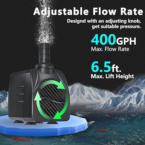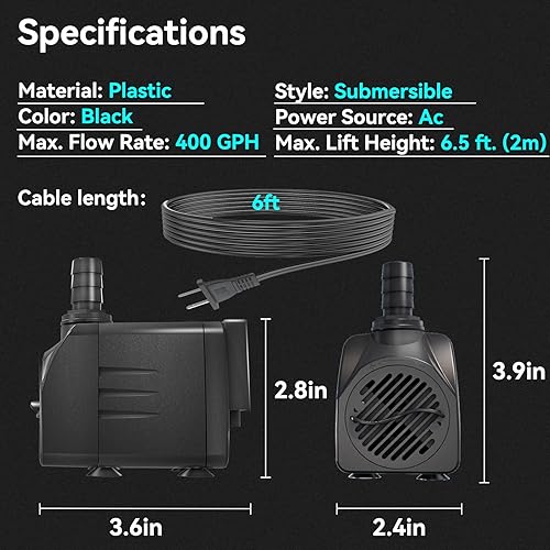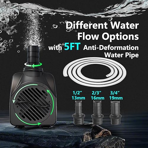 【AUTO-POWER-OFF】This fountain pump has Auto-Power-OFF function,it will shut off the power when there is no water and restart after adding water, that can protect this water feature pump from burn out,ensure the pumps service life.