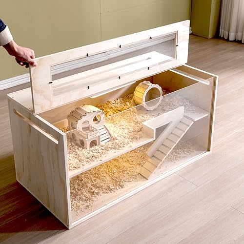 【Natural Chewproof Material】: This wooden hamster cage is made of high-density natural wood and thickened acrylic panel. It can effectively prevent small animals from gnawing.Environment-friendly materials are non-toxic and harmless.It is very suitable for hamsters, rats, Chinchilla, hedgehog, gerbil, rabbit, squirrel, lizard, red chicken, chick and most Syrian hamsters and other small animals.