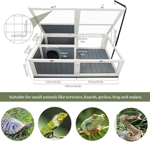 High-Quality Construction: Crafted from high-quality and safe Fir Wood, this tortoise house ensures a secure and natural habitat for your pet. The top wire lid is denser and stronger, providing added durability and protection. Overall size is 43"W x 24"D x 13"H.
