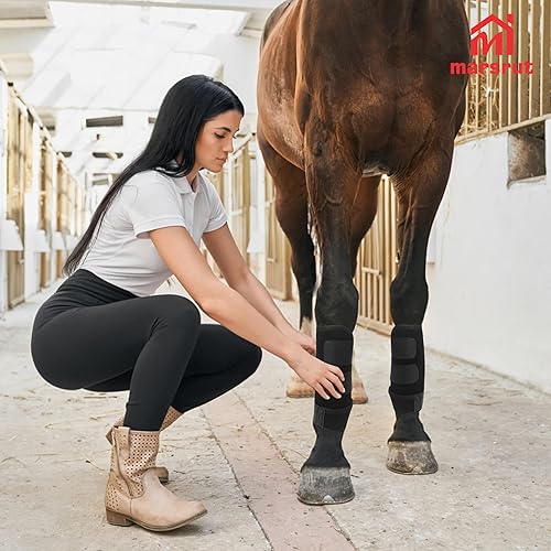 Package: 4pcs. Color: Black. Size: Front leg: 10" x 9.8". Rear leg: 9.3" x 8.8". Please check the size carefully before buying to ensure it fits your horse legs.