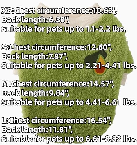 Size:XS:Chest circumference:10.63'', Back length:6.30'', Suitable for pets up to 1.1-2.2 lbs.S:Chest circumference:12.60'', Back length:7.87'', Suitable for pets up to 2.21-4.41 lbs.M:Chest circumference:14.57'', Back length:9.84'', Suitable for pets up to 4.41-6.61 lbs.L:Chest circumference:16.54'', Back length:11.81'', Suitable for pets up to 6.61-8.82 lbs.